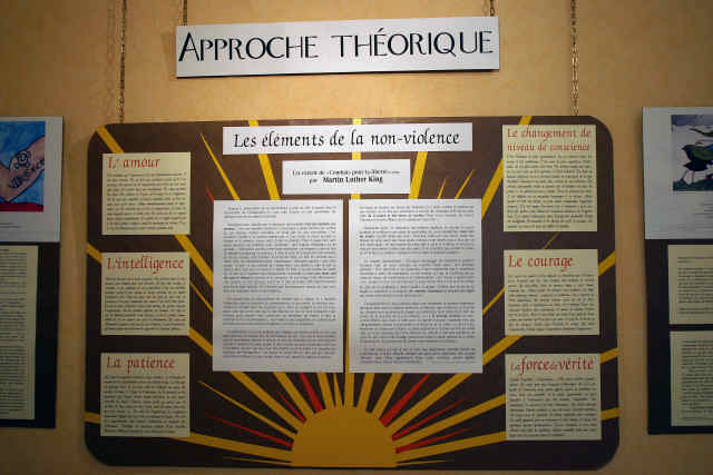 Deux panneaux (non photographiés) apportent schémas et explications détaillées sur l’attitude non-violente. Leurs titres sont :