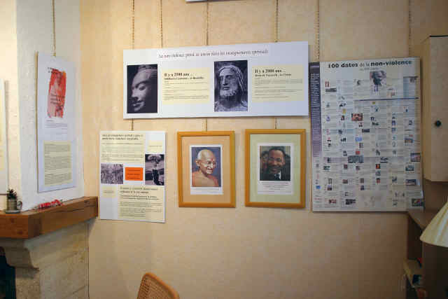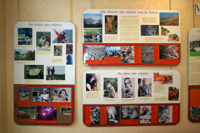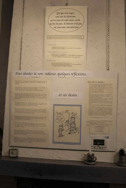 Cette exposition, aux murs du rez-de-chaussée de la "Petite Maison", a pour objectif de présenter des éléments pouvant susciter une réflexion à propos de violence et de non-violence. Prendre conscience des principes qui guident chacun de nos actes permet de nous sentir plus lucides et plus libres de modifier, au moins en partie, notre quotidien s'il ne nous convient pas.