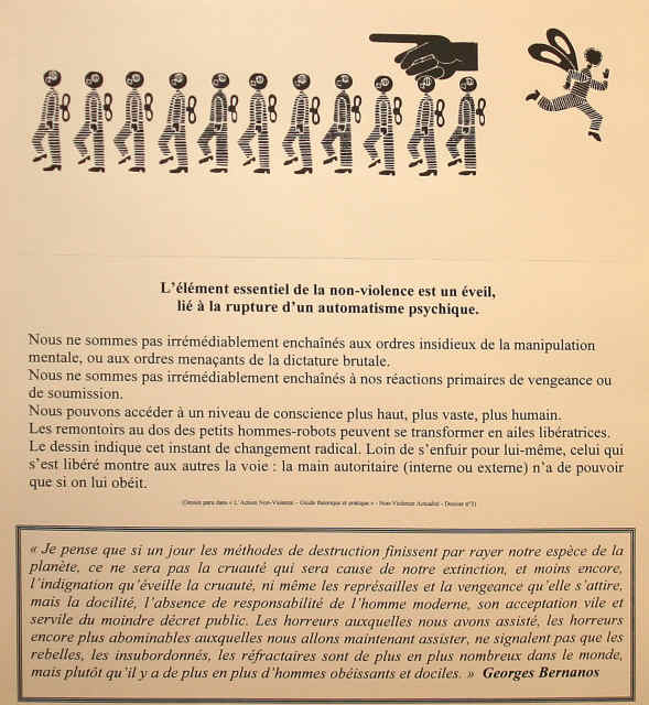 - un dessin illustrant un élément essentiel de la non-violence : un éveil de conscience (rupture d’un automatisme psychique).