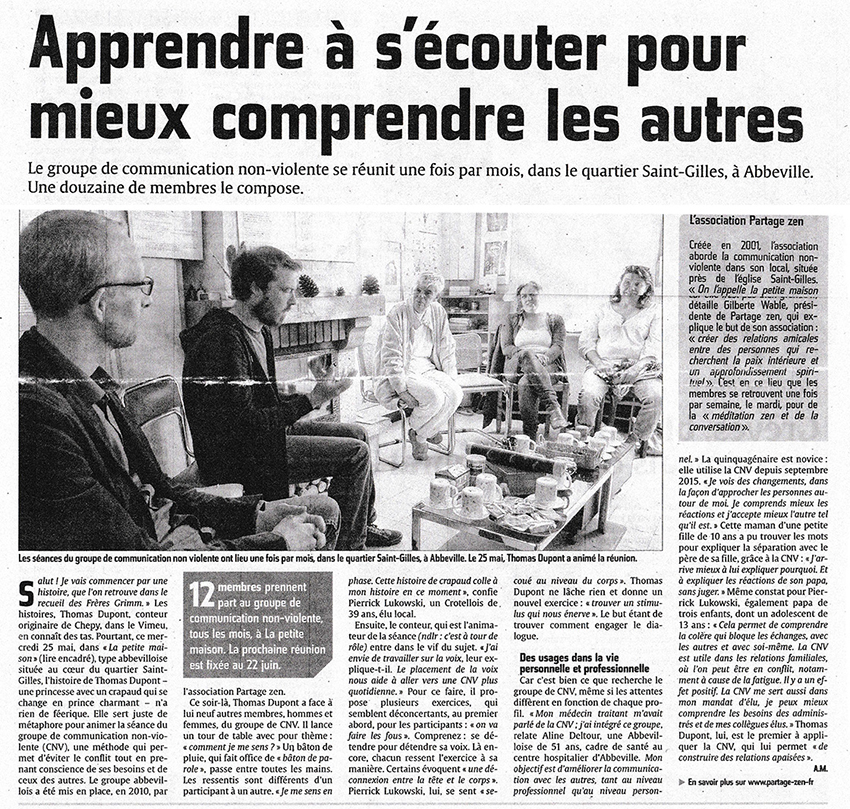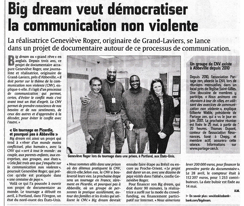 La CNV peut-elle se diffuser à grande échelle ? Bien sûr, et nous le souhaitons vivement. Car si la CNV permet d’abord de mieux gérer ses conflits personnels, elle ouvre aussi d'étonnantes perspectives, et un grand espoir pour préparer le monde de demain ! A ce sujet, nous avons eu la joie de recevoir Geneviève Roger à la "Petite Maison", le 27 avril 2016. Geneviève et son équipe préparaient "Big Dream", un film documentaire à propos de la CNV. La visite de Geneviève Roger a donné lieu à un article dans le "Courrier Picard" le 30 avril 2016. Puis la journaliste, venue nous voir à la "Petite Maison" lors de la séance CNV qui a suivi, a écrit un article paru dans le journal du 28 mai. Voici les deux articles : *************************************************************************************************************************************************