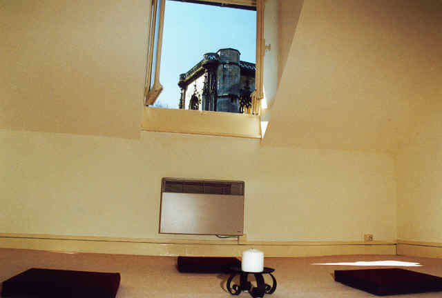 Tout d'abord, voici notre "zendo" ( lieu où nous méditons ). Par la fenêtre ouverte, on aperçoit l'église Saint-Gilles. (vous trouverez d'autres images à la rubrique "Photos")